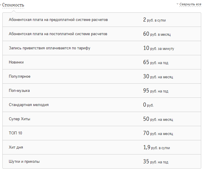 Другие аудиозаписи вместо гудков предоставляются за определенную плату. Ознакомиться с полным перечнем мелодий можно на сайте компании, где он выделен в удобную табличку.