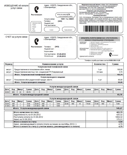 Расшифровка квитанции Ростелекома