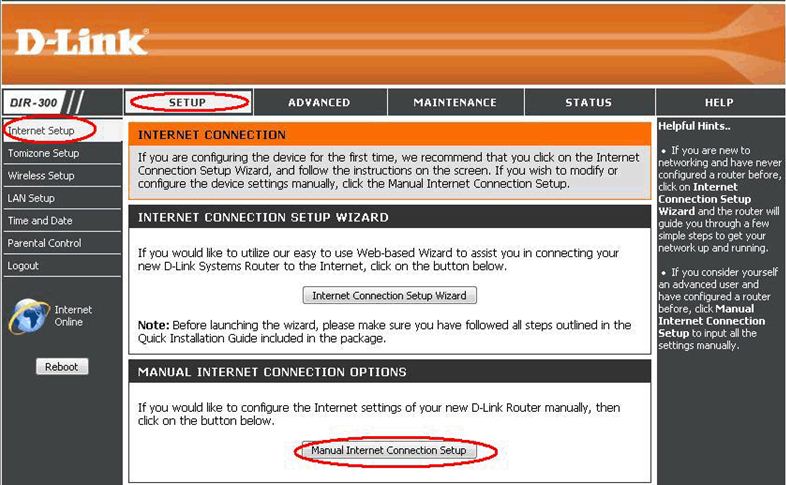 Кликните на вкладке “Setup”, выберите меню “Internet Setup” и, в завершении кликните на «Manual Internet Connection Setup».