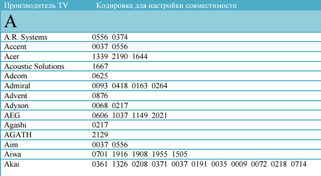 Важно: у одного производителя может быть несколько кодировок. Поэтому если одна числовая последовательность не подошла, используйте другие коды для пультов Ростелеком.