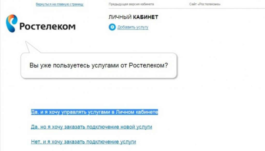 При входе в ЛК вы увидите вопрос о том, пользуетесь ли вы предложениями Ростелеком и вариантами ответа на данный вопрос с перечислениями конкретных действий. По-умолчанию выбираем «Да, и я хочу управлять услугами в Личном кабинете», тем более что, там, вы легко выполните любые другие действия.