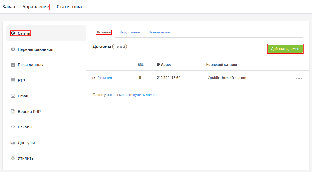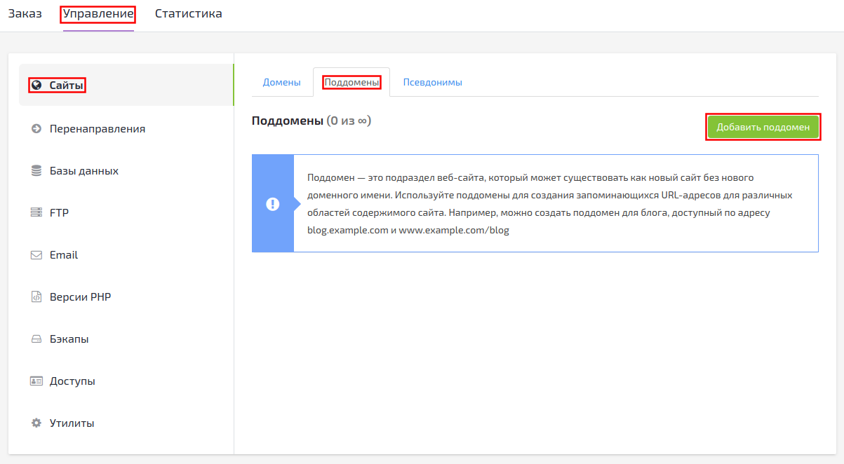 Дополнительный домен (Поддомен) — это домен, который система хранит как поддомен основного сайта.