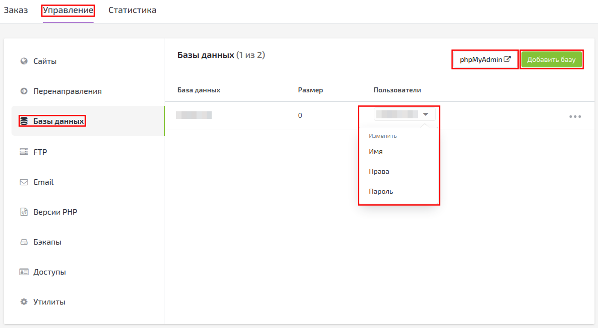 - Здесь вы можете Выполнять операции с БД, а именно Добавить новую базу данных, Добавить пользователя БД. Изменить имя, пароль или назначить права.