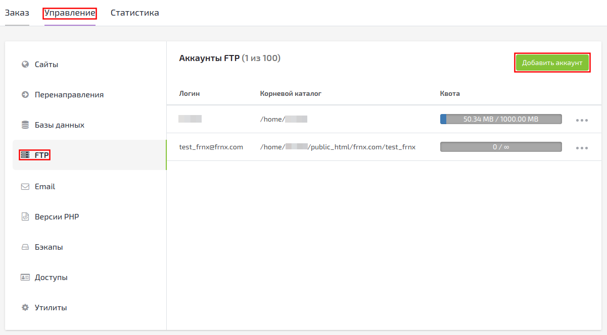 - Возможность добавить или удалить FTP-аккаунт, указать Имя пользователя, Корневой каталог и квоту на дисковое пространство для аккаунта.