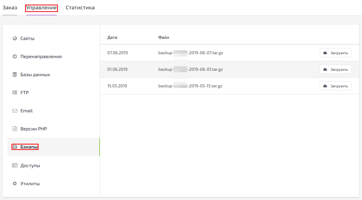 - В этом разделе у вас есть возможность скачивать резервные копии всех данных вашего заказа VH (сайтов, SSL-сертификатов, почтовых ящиков, баз данных).