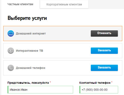 Далее все что необходимо от пользователя – это нажать кнопку «Заказать», после чего он перейдет на следующую страницу ввода данных, которую также следует заполнить. После этого будет выполнена автоматическая проверка на наличие подключенных услуг по данному адресу и еще не выполненных заявок на подключение. Если все сделано правильно, то перед вами появиться ваз заказ.