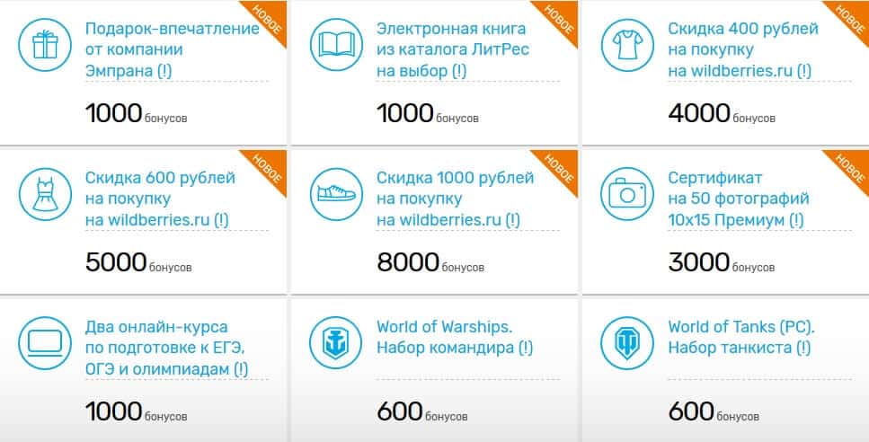 Желающим обменять бонусы на подарки от партнёров следует помнить, что этот перечень меняется активнее всего, поэтому стоит регулярно проверять обновления и появление новых предложений. Сейчас клиентам предоставляется: