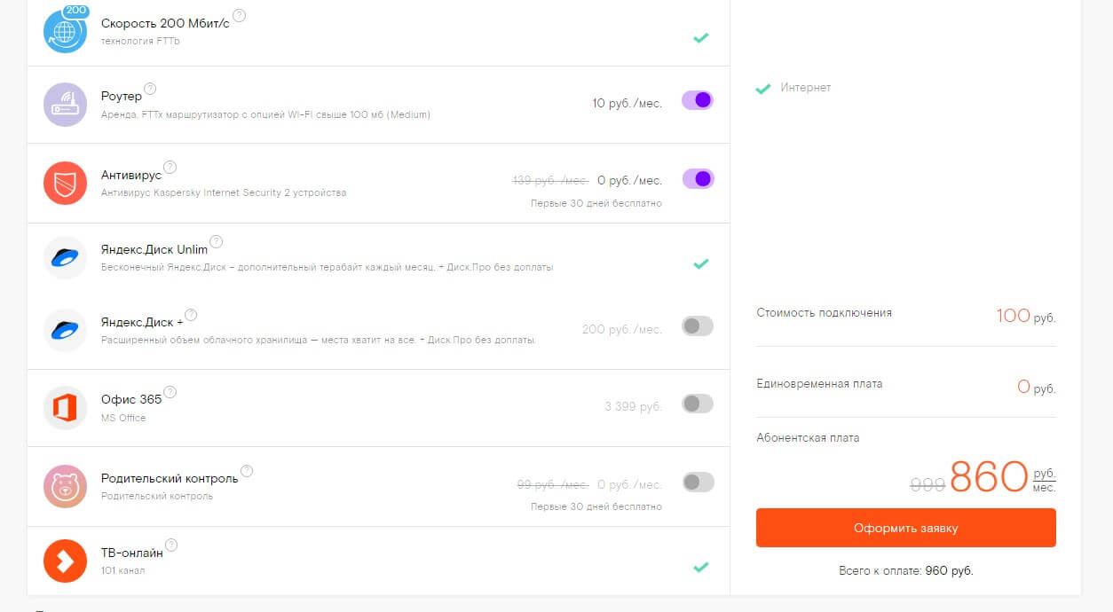 Учтите, что конечная стоимость продукта зависит от выбранных услуг и оборудования. Уточняйте итоговую сумму перед подачей заявки, чтобы после размер абонплаты не стал сюрпризом.