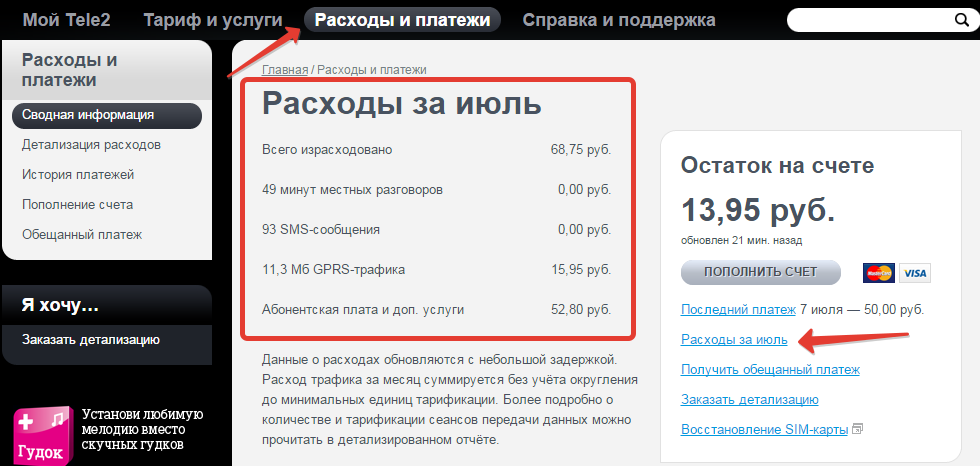 После непродолжительного ожидания на странице отобразятся краткие сведения о том, сколько вы потратили денег за текущий месяц с указанием количества минут, SMS-сообщений и мегабайт интернет-трафика.